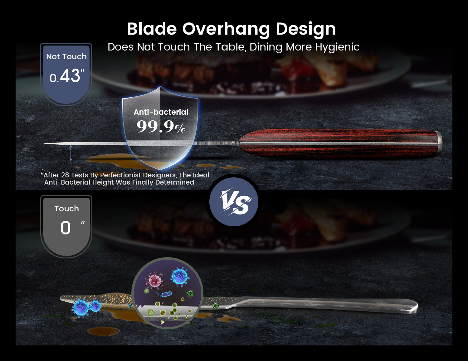 - Considering the ordinary steak knife in contact with the table during the meal caused by the staining health hazards and increased cleaning burden, we overturned the traditional steak knife design after 28 repeated tests and finally determined the 0.43-inch blade suspension height to ensure the health of your and your family