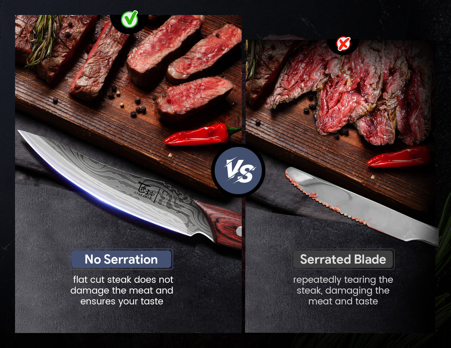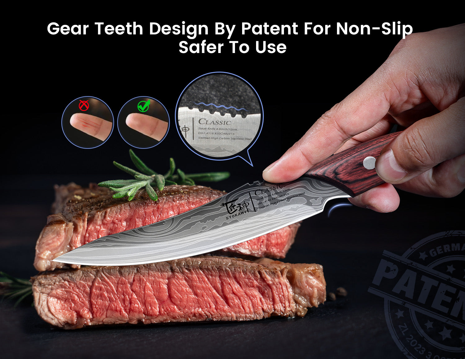 - For non-slip consideration, we have added a contemporary gear teeth element to this steak knife set. Combined with the overall classic shape, it is both beautiful and practical - ensuring a stable grip even when wet and ensuring your safety while enjoying your food